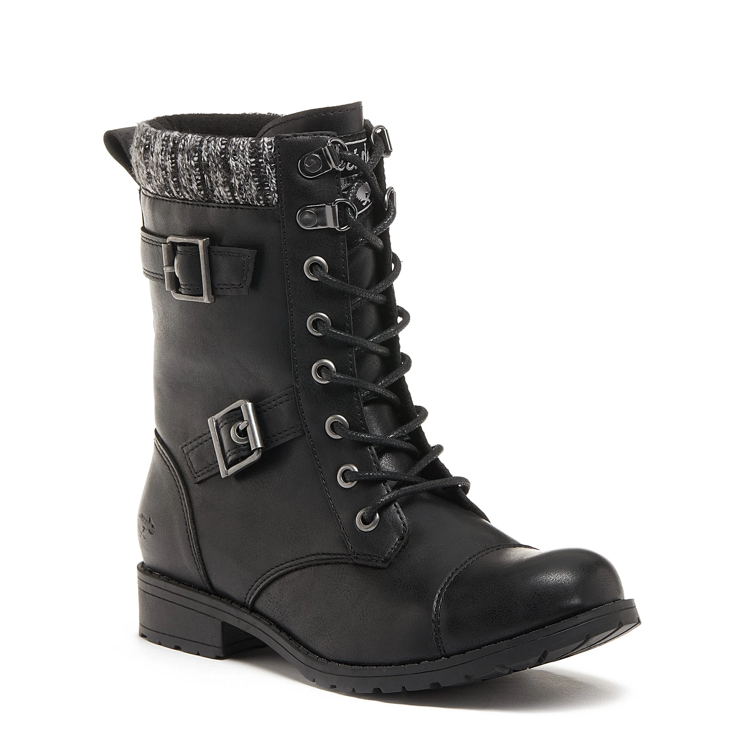 Other key details: Decorative buckles, round toe, knit cuff detail