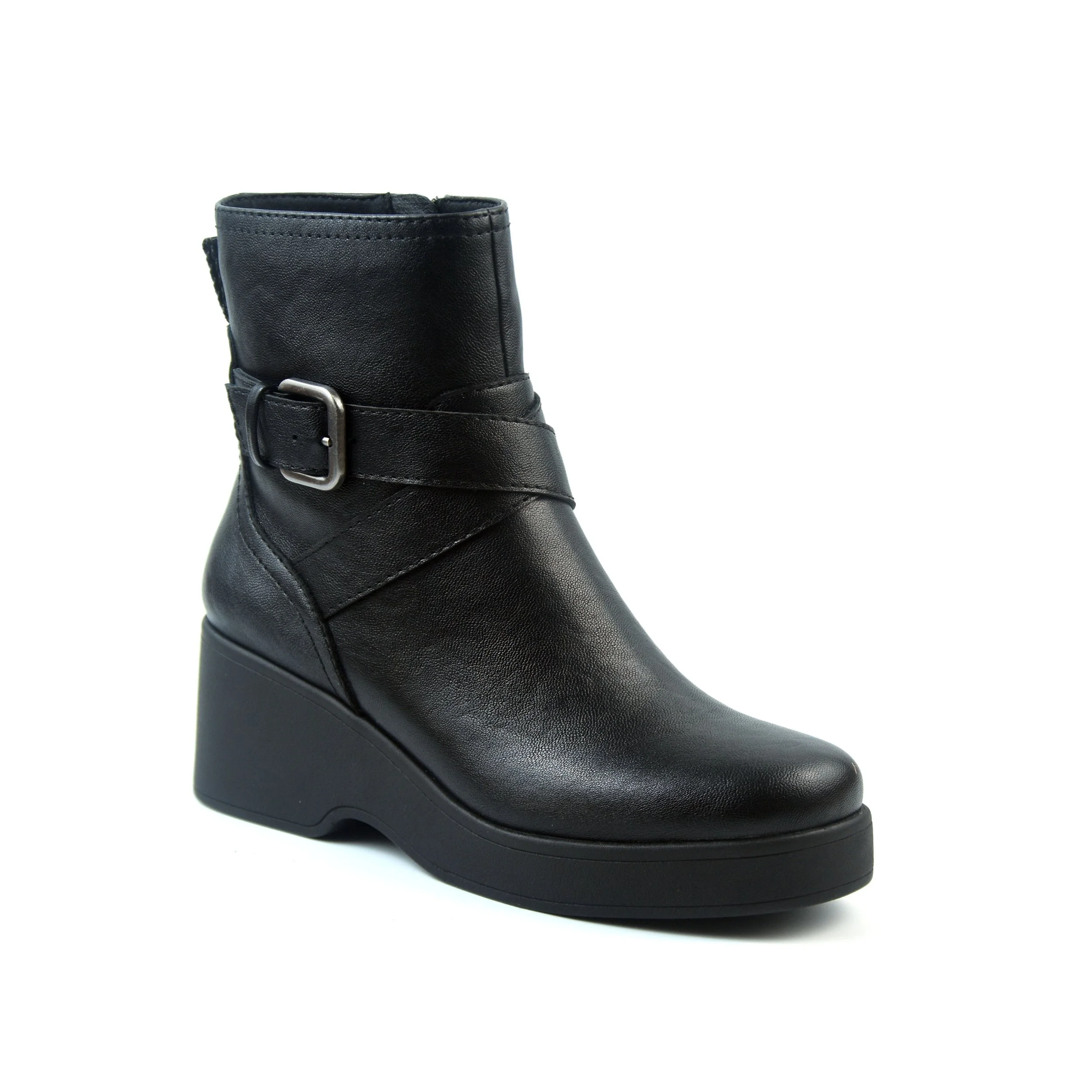 CLASSIC ANKLE BOOTIE STYLE WITH BUCKLE STRAPPING AND COMFORT INSOLE ON A FEMININE YET CASUAL FLEX-CUSHIONED WEDGE UNIT
