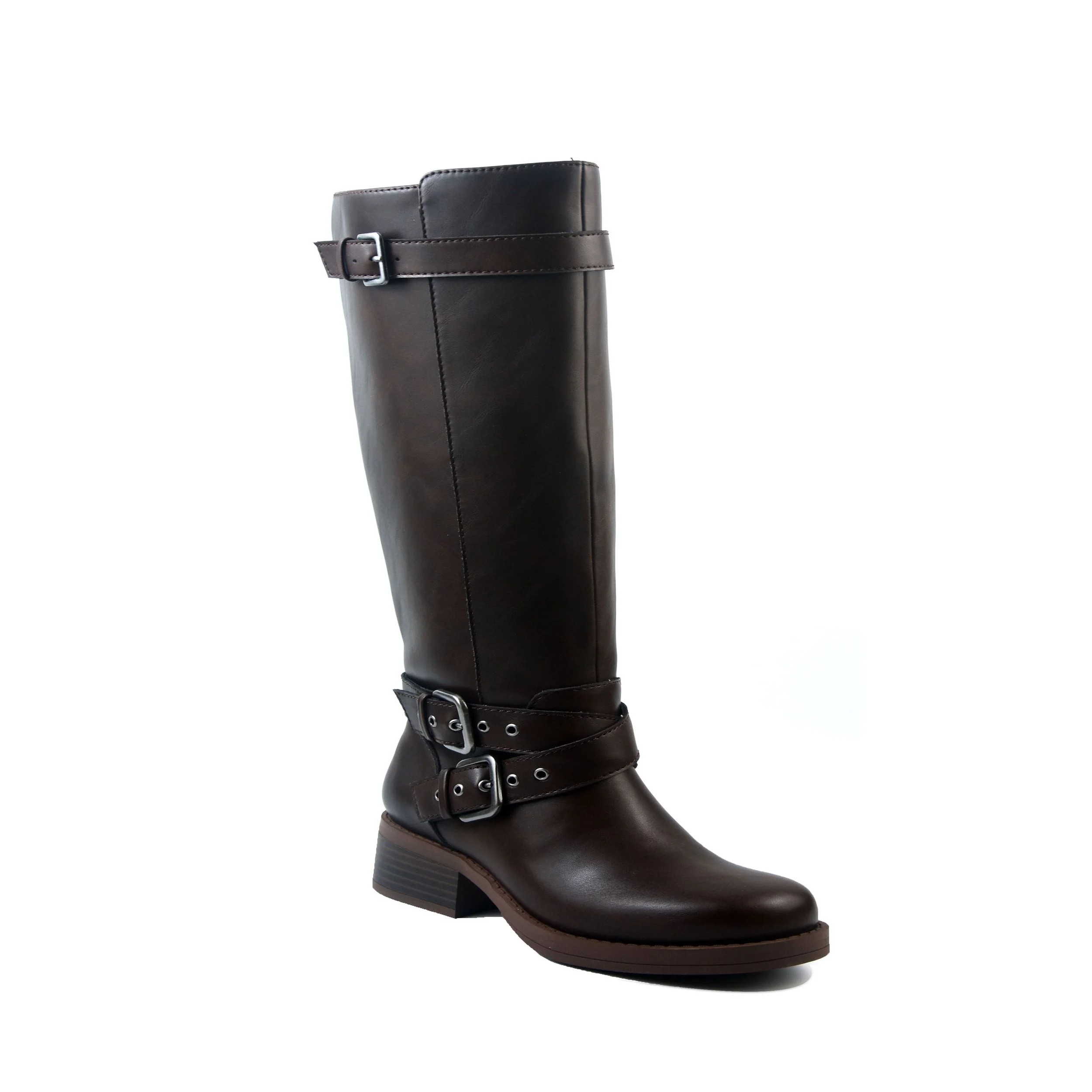 TALL, KNEE HIGH SHAFT CLASSIC RIDING BOOT SILHOUETTE WITH BUCKLE STRAPPING DETAIL AND CUSHIONED INSOLE ON WELTED FLEX-SOLE UNIT WITH A BLOCK, STACKED HEEL