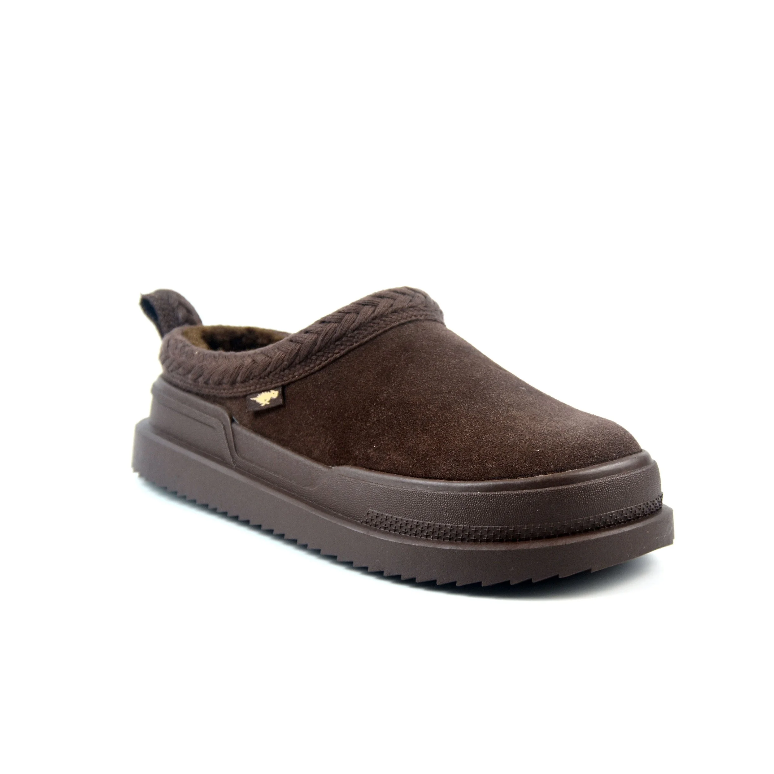 RELAXGENUINE SUEDE EASY SLIDE STYLE WITH COZY SHEARLING LINING AND WOVEN TOPLINE DETAIL ON AN ELEVATED CUSHY RUBBER OUTSOLE COW SUEDEDARK BROWN COW SUEDE BLACK COW SUEDE BLACK